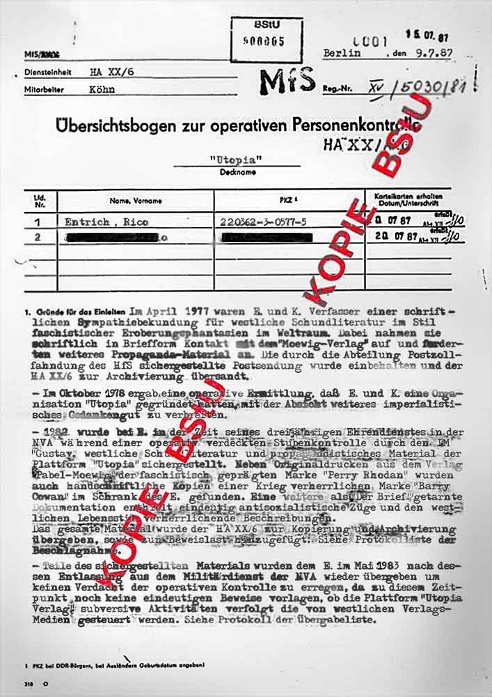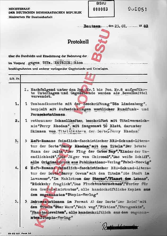 „… während einer operativ verdeckten Stubenkontrolle durch den IM ‚Gustav‘ wurde westliche Schund-Literatur und propagandistisches Material der Plattform ‚Utopia‘ sichergestellt.“  – Aktenvermerk –