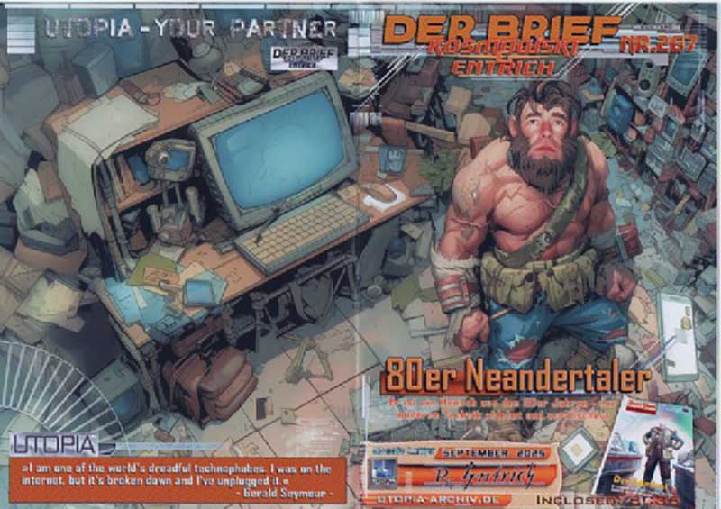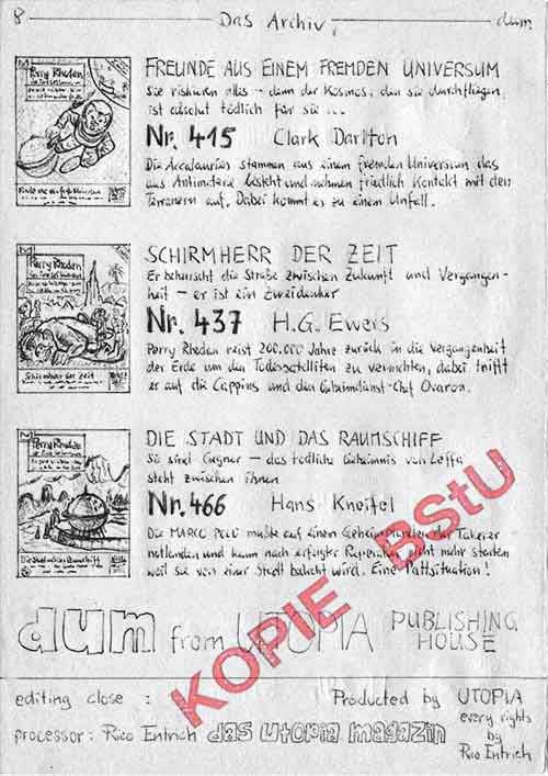 „Innen beiliegend fand sich ein Exemplar einer Leih-Roman-Liste des sogenannten ‚Utopia-Archiv‘ mit 15 angebotenen Titeln der faschistisch geprägten Marke ‚Perry Rhodan‘ der westlichen Verlags-Einrichtung ‚Pabel-Moewig Verlag KG‘ mit Sitz in Rastatt.“