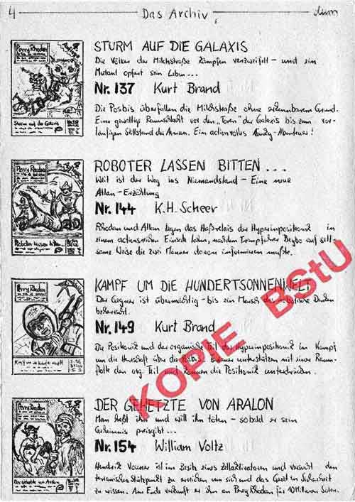 “… 15 angebotene Titeln der faschistisch geprägten Marke ‚Perry Rhodan‘ der westlichen Verlags-Einrichtung ‚Pabel-Moewig Verlag KG‘ mit Sitz in Rastatt.“ – Aktenvermerk –
