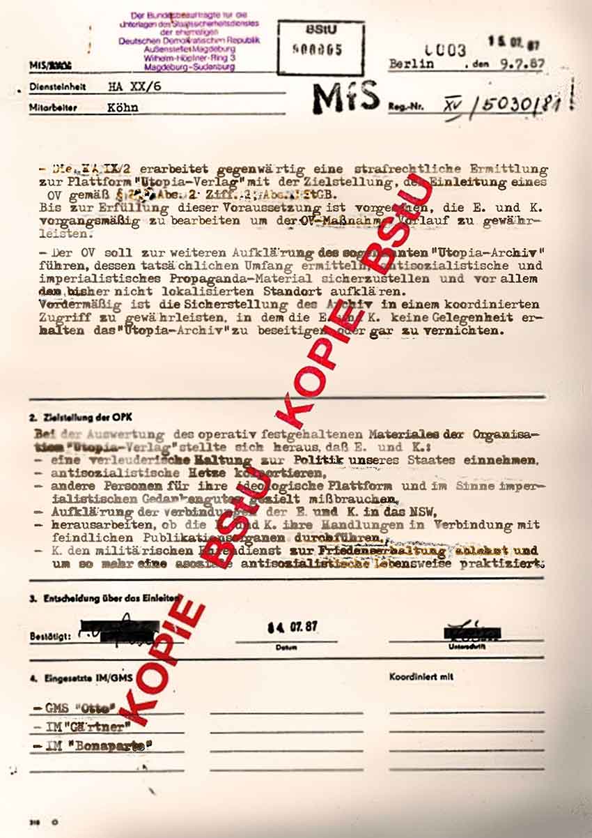 Der Brief war nie angekommen – er war auf dem Radar der Staatssicherheit gelandet, sorgfältig abgelegt in einem Aktenhefter mit der Aufschrift: „Utopia-Verlag“.